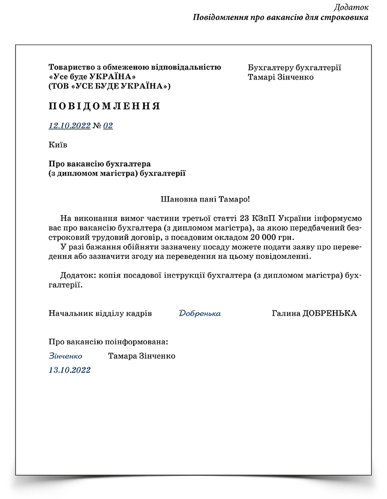 Доцільно, щоб повідомлення підписувала посадова особа, наприклад, начальник відділу кадрів. Такий обов’язок радимо прописати в його посадовій інструкції.