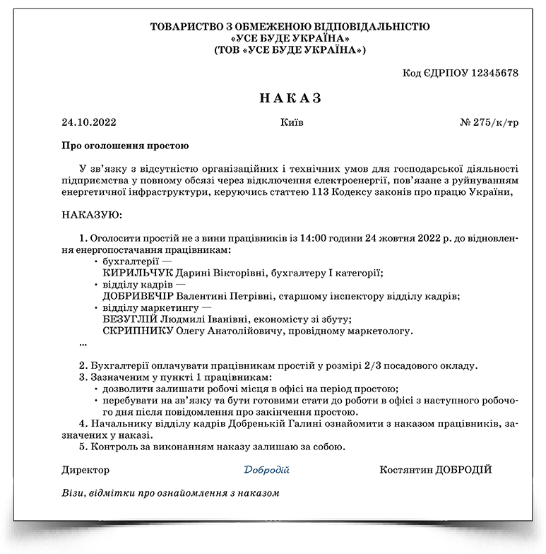 - Навіть якщо маєте графік відключення електроенергії, у наказі вкажіть лише час, з якого запровадили простій, адже електроенергію можуть увімкнути раніше або пізніше, ніж передбачає графік відключень