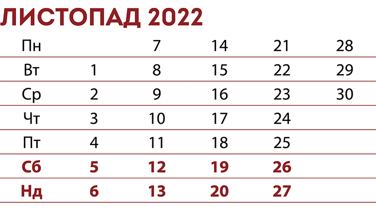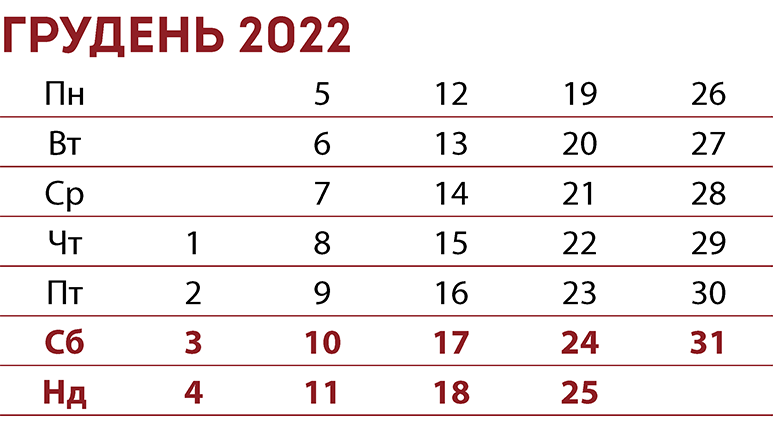 неробочий день* — Різдво Христове* Якщо воєнний стан не продовжать після 21 листопада 2022 року. - 26 грудня